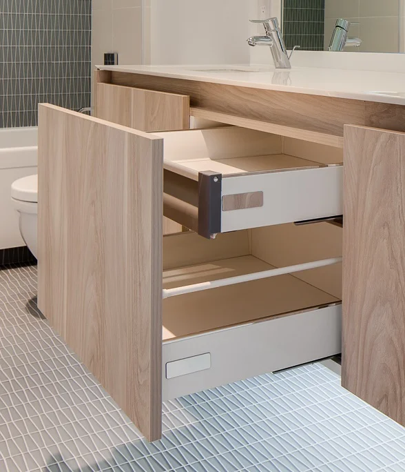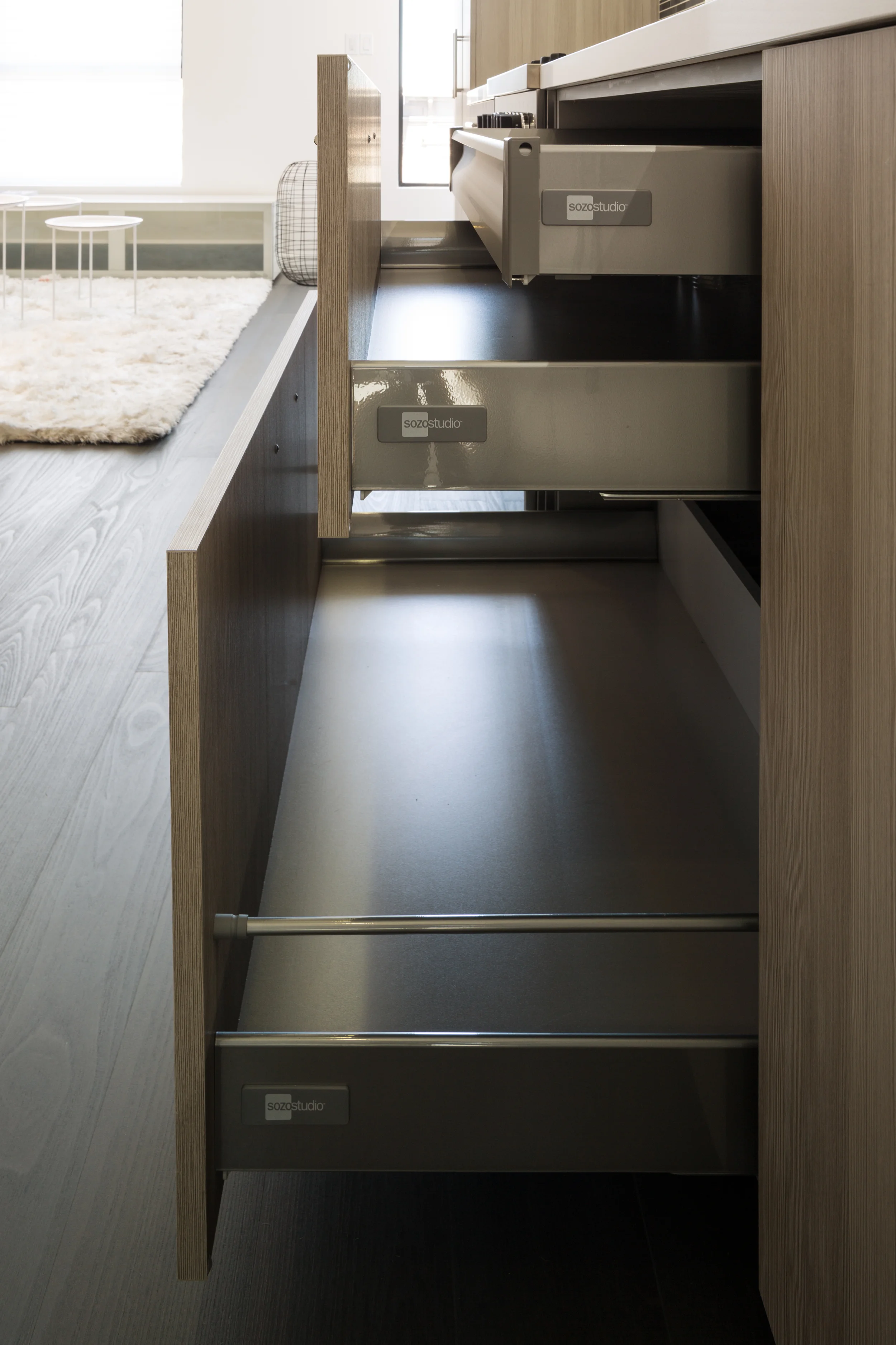 Sozo's Studio kitchens feature ergonomic drawers instead of hinged doors in base cabinets. Drawer-within drawer optimizes space.