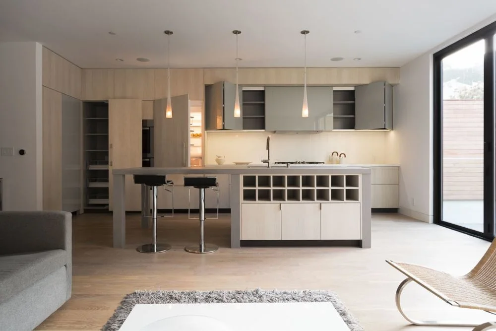 Combine ingredients to create a kitchen that optimizes ergonomic storage. Use the Vanilla panels to create wine niches.