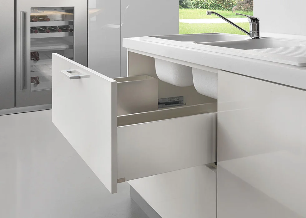 Our new drawer system is offered in three different heights, with a choice of a champagne or silver finish. The MetallaBox system is a crisp and elegant drawer option with one of the thinnest side profiles on the market. A Sozo favorite for bath vanities and closets.